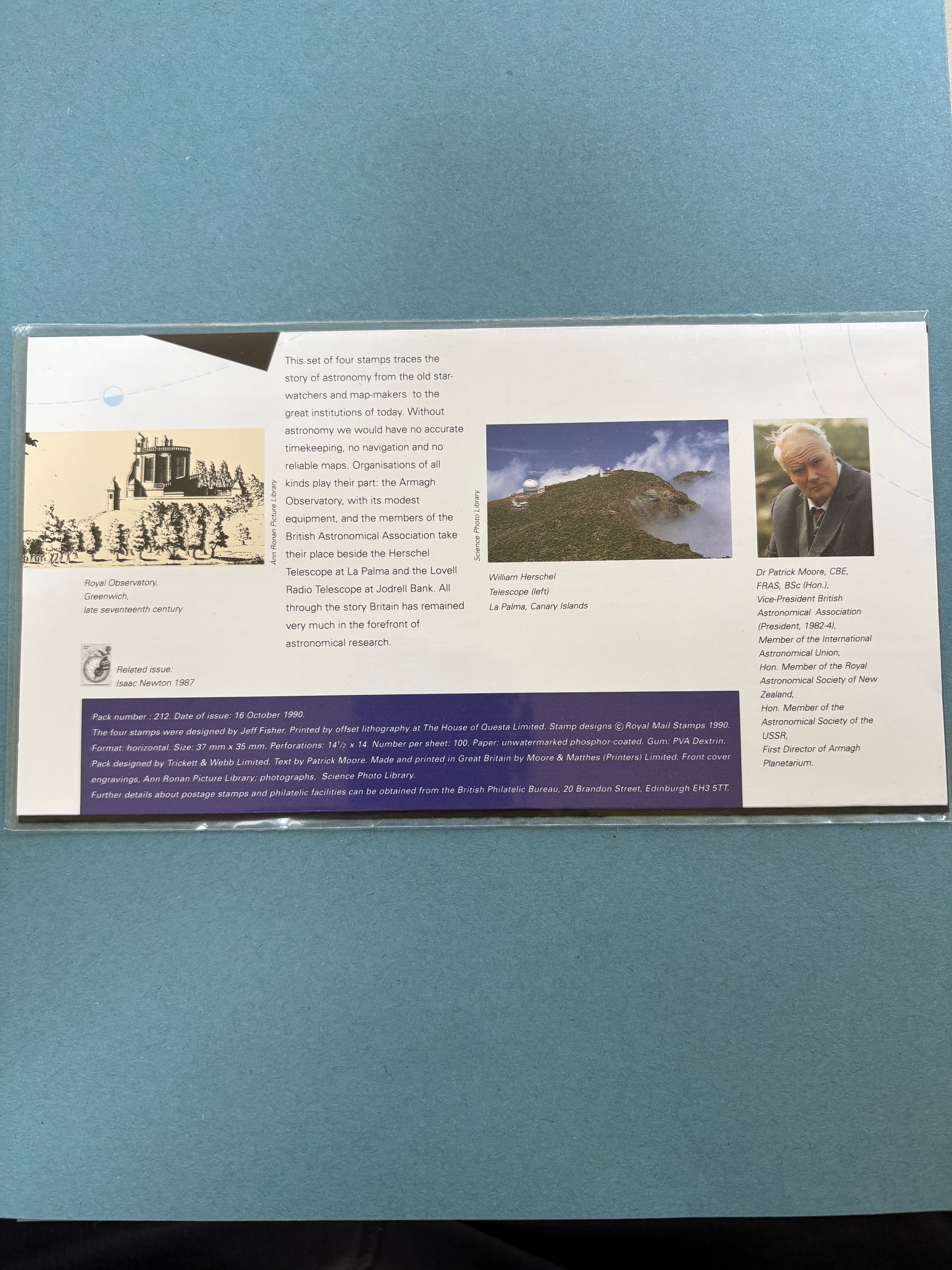 Royal Mail Presentation Pack 212- Astronomy, commemorating the centenary of the British Astronomical Association and the bicentenary of the Armagh Observatory - produced in 1990, complete and in mint condition with all stamps and inserts.